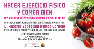El próximo miércoles 6 de abril a las 18:30hrs., en el Centro Cívico Suárez Naranjo, tendrá lugar la conferencia «Hacer ejercicio Físico y Comer Bien, dos pilares para vivir más saludable y bailar mejor», impartida por D. Antonio Sebastián Ramos Gordillo, profesor titular de la Universidad de Las Palmas de Gran Canaria.
